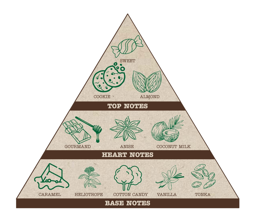 - Základ - karamel, heliotrop, cukrová vata, vanilka, tonkové boby